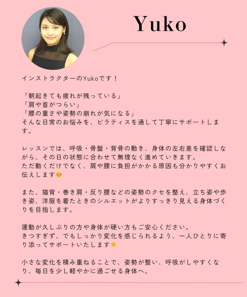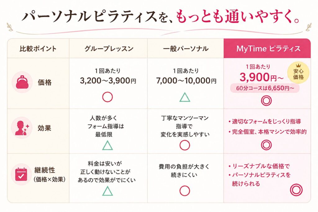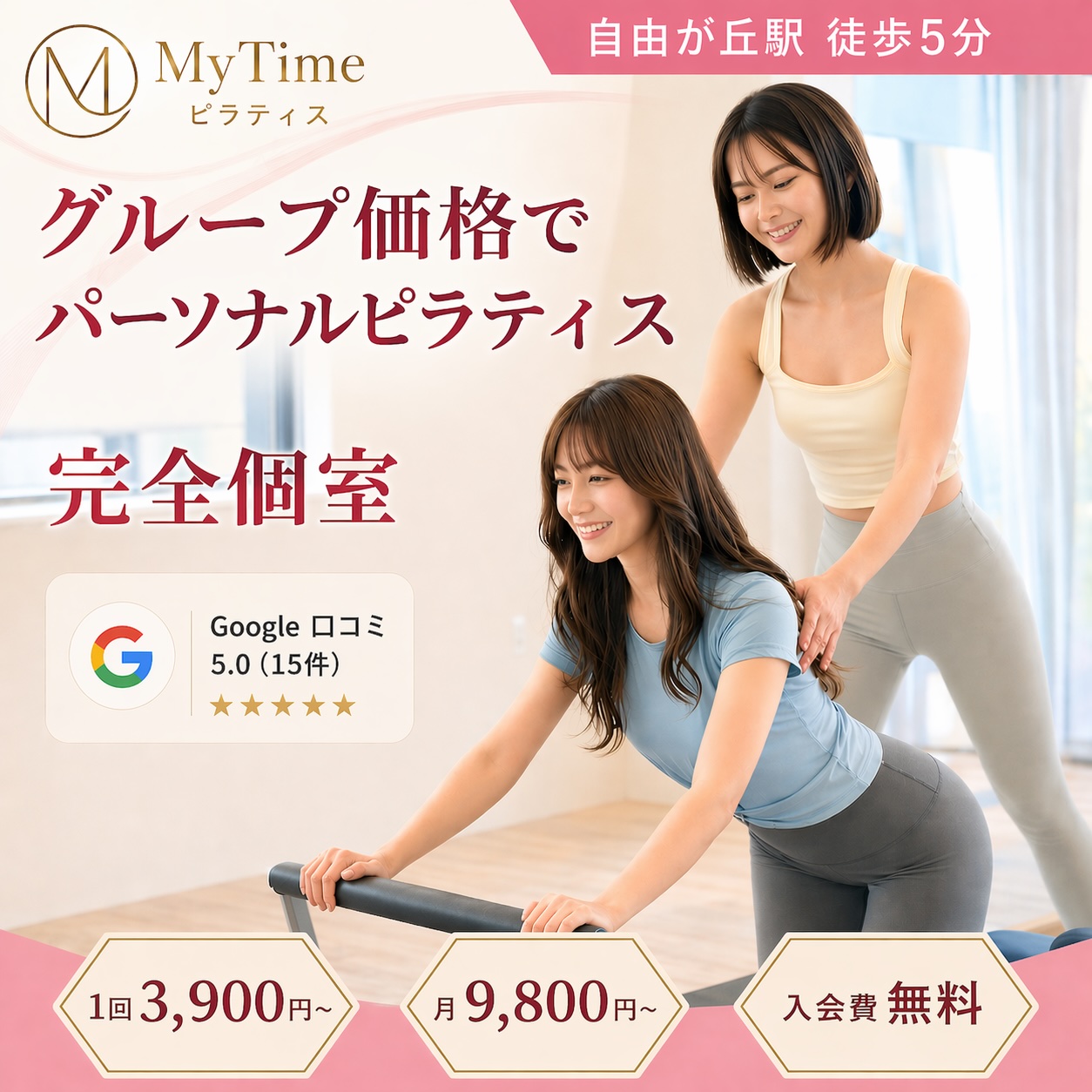 -OPEN記念キャンペーン- 料金 パーソナルでも圧倒的に 「続けやすい価格」を実現! 30分コース1回あたり料金 体験レッスン 無料無料 月2回プラン 4,900円9,800円 月4回プラン 4,400円17,600円 月8回プラン 3,900円31,200円 回数券8回プラン 4,400円35,200円 60分コース1回あたり料金 体験レッスン 無料無料 月2回プラン 7,400円14,800円 月4回プラン 6,900円27,600円 月8回プラン 6,650円53,200円 回数券8回プラン 6,900円55,200円 ※レンタルウェア:体験レッスンにて無料/ 通常330円(1回) ※表示金額は全て税込価格です。 Q&A Q. 初心者でも大丈夫ですか? パーソナルレッスンですので、丁寧にサポートさせていただきます。安心してご来店ください♪ Q. 準備するものはありますか? 特に必要ありません♪体験レッスンではウェアや靴下を無料で貸し出しております。 Q. 子どもを連れてきても良いですか? もちろん大丈夫です♪完全個室サロンですので、安心してお子様と一緒にご来店ください。 Q. 40代や50代でも大丈夫ですか? ピラティスは年代関係なく皆様に行なっていただけるものですのでご安心ください。 アクセス 住所: 〒158-0083 東京都世田谷区奥沢7丁目4−11 クレスト自由ヶ丘201号室営業時間: (月)〜(日) 8:00〜21:30アクセス : 自由が丘駅から徒歩5分(Google マップ調べ) -OPEN記念キャンペーン- 無料体験レッスンを予約 ここから無料体験 LINEから無料予約